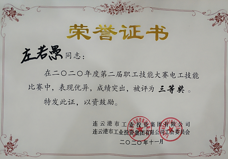 通过激烈竞争,公司生产设备部庄若愚在比赛中荣获三等奖的好成绩。集团公司工会主席刘承志为获奖职工颁奖。