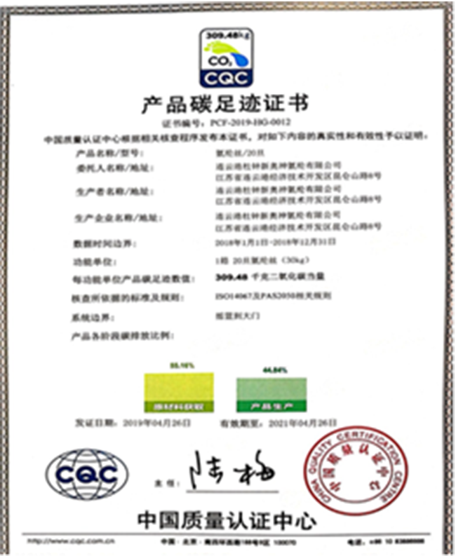 2019年,公司顺利通过了碳排查,获得了由中国质量认证中心发放20D氨纶纤维的的碳足迹证书。